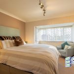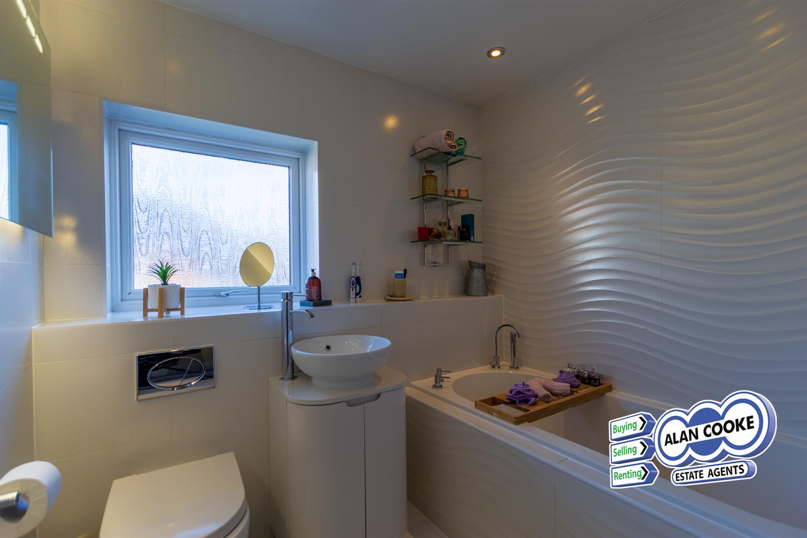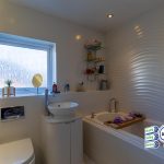 Beautiful modern bathroom of bath tub, low wc, vanity washbasin, uPVC double glazed window, heated towel rail