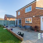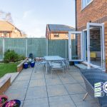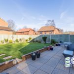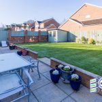 To rear: West-facing aspect - Well-maintained, enclosed, lawned garden with fenced and stocked border, patio.