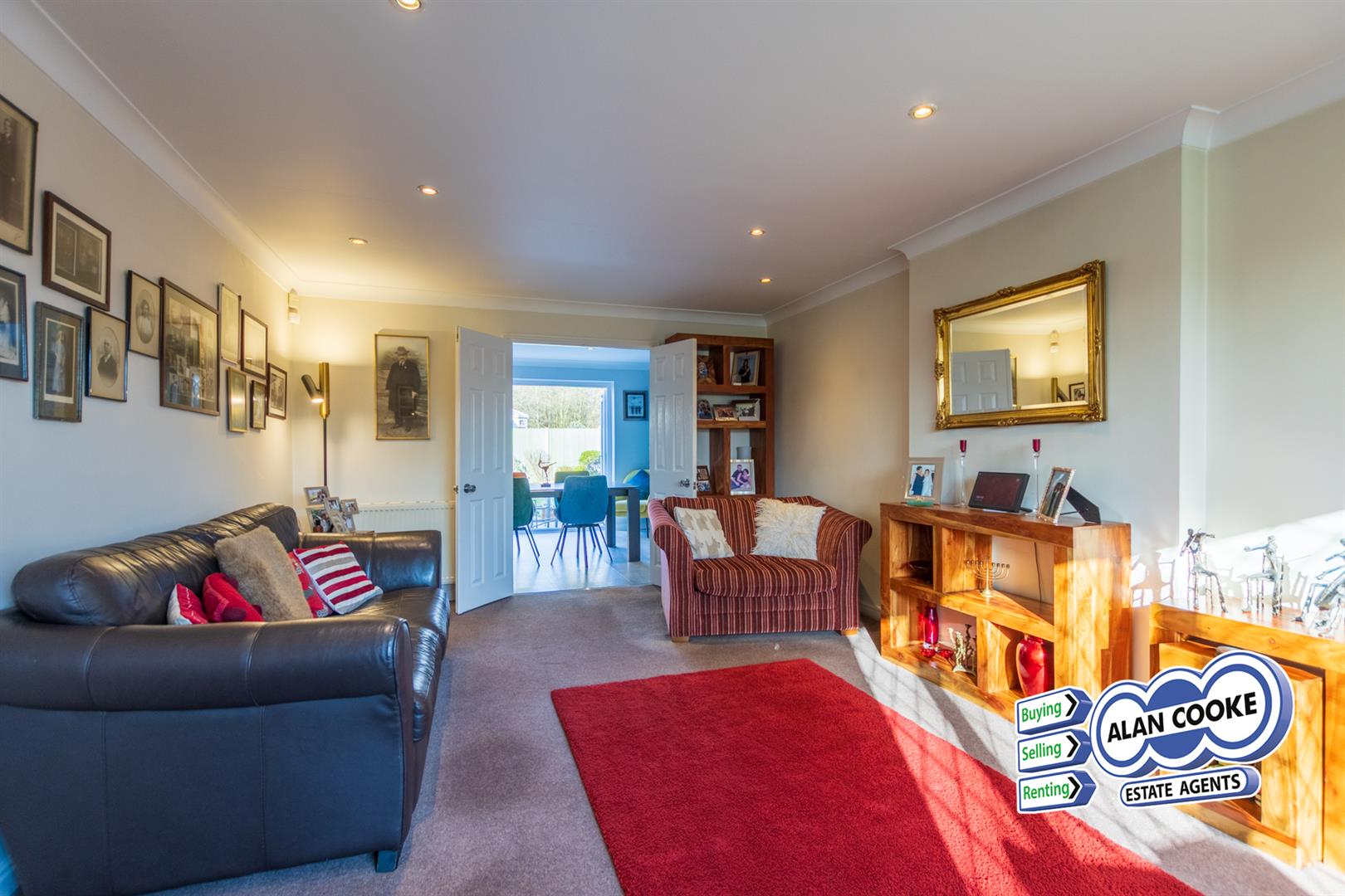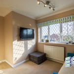 uPVC double-glazed bay window overlooking woodland copse, 2 x central heating radiators, inset ceiling lighting, double doors opening into dining room.