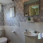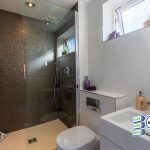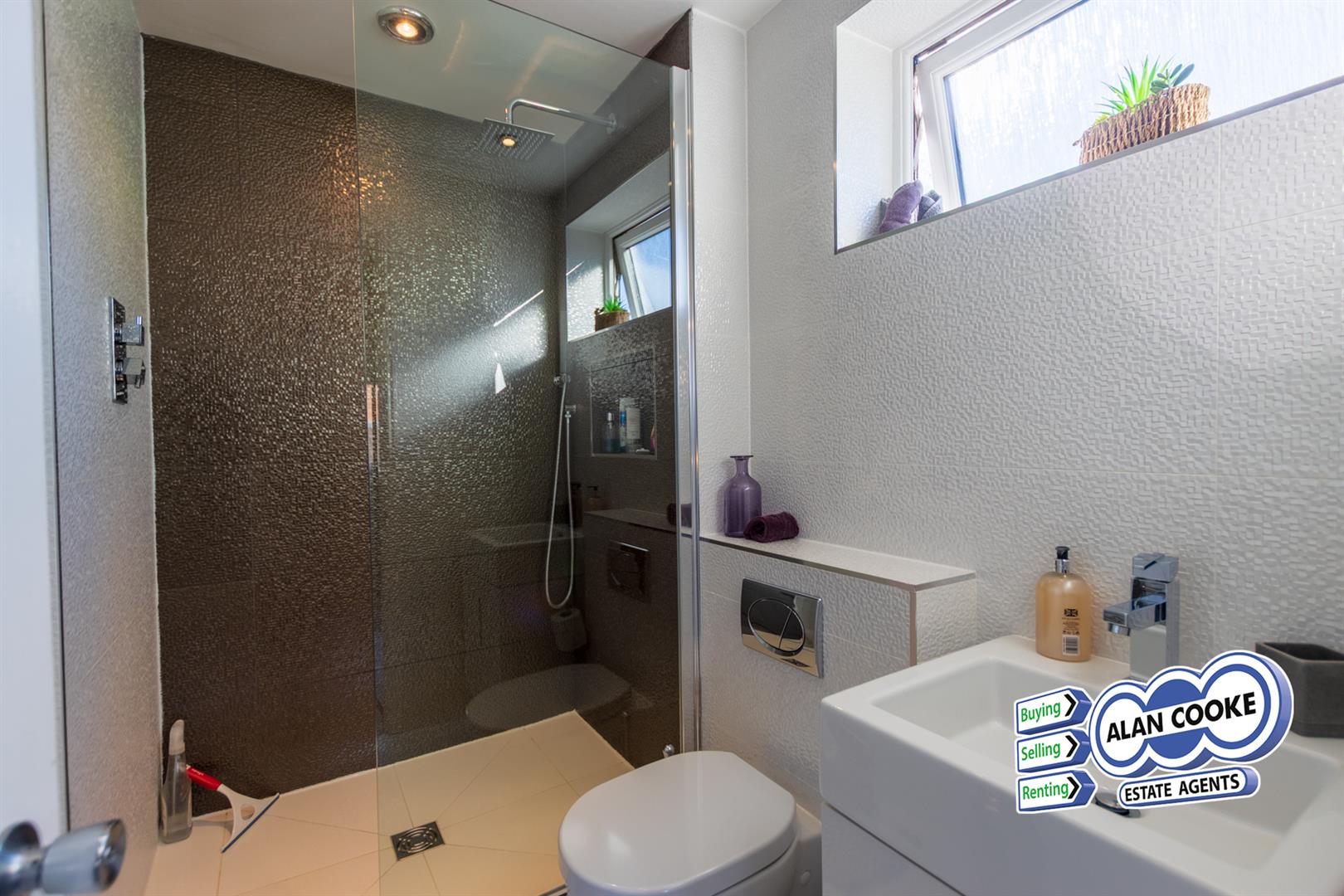 Walk-in shower cubicle with rainfall drip shower head, low wc, vanity washbasin, uPVC double glazed window, heated towel rail